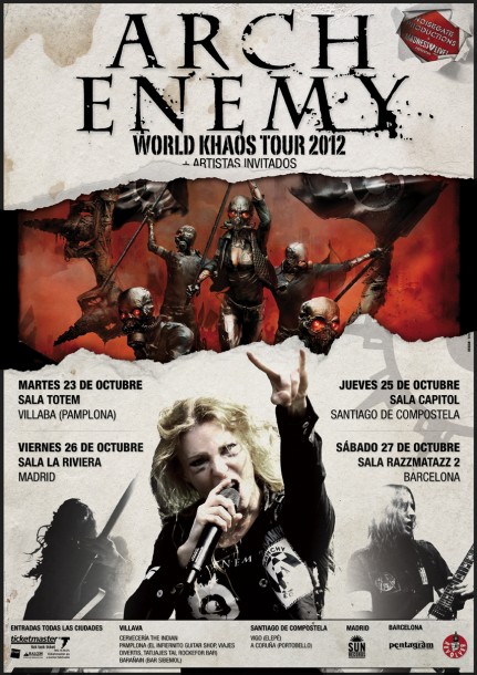 ¡ARCH ENEMY están de regreso! Varios meses después de lanzar su último trabajo, “Kahos Legions”, el grupo sueco volverá a nuestropaís dentro de su “World Khaos Tour 2012” para regalarnos cuatro fechas de la mano de Madness Live. Por si esta gira de presentación de su último trabajo de larga duración no fuera suficiente, en esta ocasión vendrán acompañados por, nada más y nada menos, que los legendarios thrashers canadienses de VOIVOD. Sí, solo en esta ocasión, ¡ya que serán invitados de los germanos únicamente en estas cuatro fechas españolas! Finalmente, tras una formación consolidada y otra banda mítica, los teloneros serán una joven promesa también canadiense: TITANS EVE, un joven combo de Thrash Metal que acaba de lanzar su segundo compacto bajo el nombre de “Life Apocalypse”.