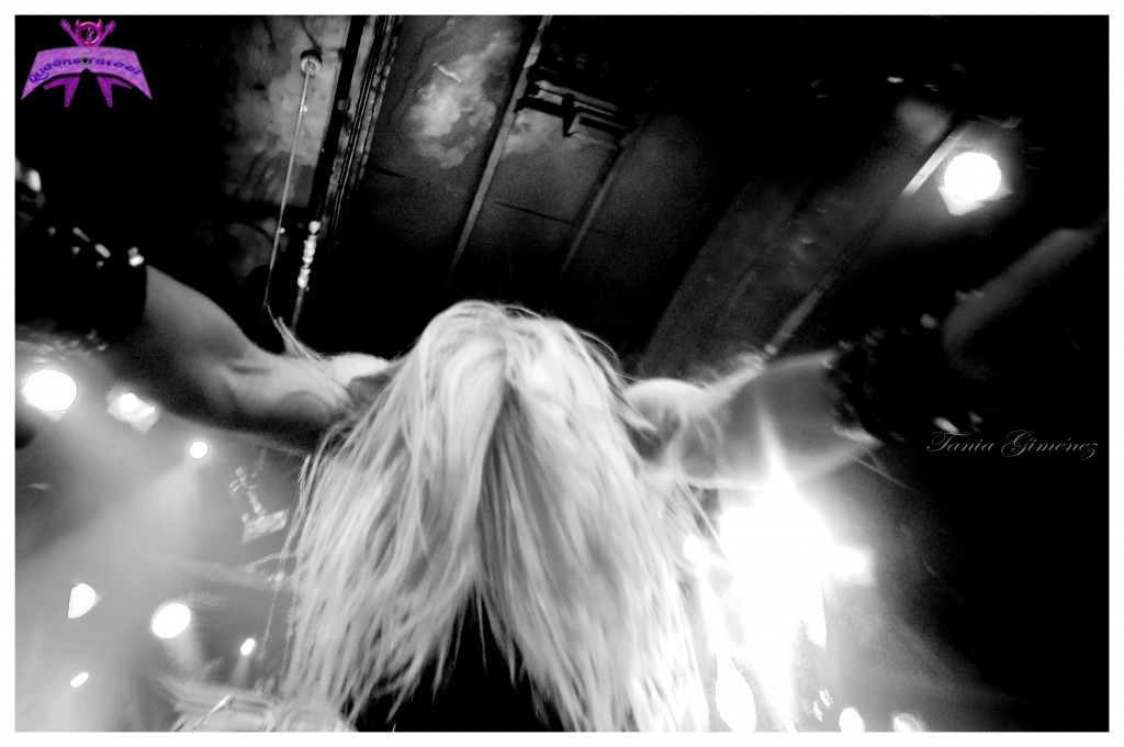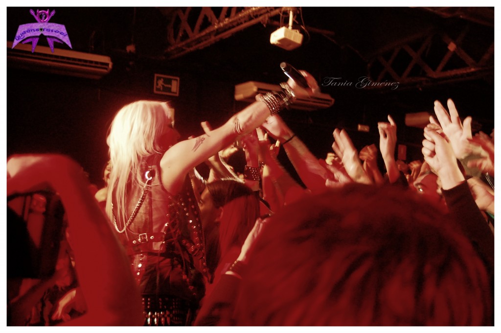 escenario como un verdadero torbellino, por fin salía Doro a escena, camuflándose entre las ovaciones del público que ardía en deseos de verla. Y es que, como ella mismo repitió en varias ocasiones durante el concierto, el cariño que le dan sus seguidores españoles es increíble y, por ello, siempre se siente como en casa cuando se deja ver por nuestro país, eso por no mencionar lo agradecida que se mostraba cada vez que los fans allí congregados mostraban su cariño por la carismática vocalista. Pero, sentimentalismos aparte, Doro salió con su energía habitual, respaldada por una increíble banda que se movía sin parar por el escenario arrasando con todo, como si de un huracán se tratara, para interpretar tres trallazos, tres verdaderos clásicos seguidos como fueron «Hellraiser», «I Rule de Ruins» y «Burning the Witches» (lo cierto es que en el repertorio hubo muchísimas canciones de su época como WARLOCK). Hacia el final de «Burning the Wiches» la cantante bajó al foso para cantar con sus seguidores, dándoles el micrófono y, cómo no, sin borrar de su rostro una amplia sonrisa. Algo que, por cierto, repetiría en más ocasiones a lo largo del concierto y, obviamente, los seguidores que se encontraban aquella noche en Trasmatas (muchos aún con resaca del Metalcova) lo agradecieron mucho. De hecho la cercanía con su público y la sencillez de Doro fueron algo muy a destacar, aunque todos ya sabemos la amabilidad de la artista, además del respeto a sus seguidores y su ilusión por lo que hace.