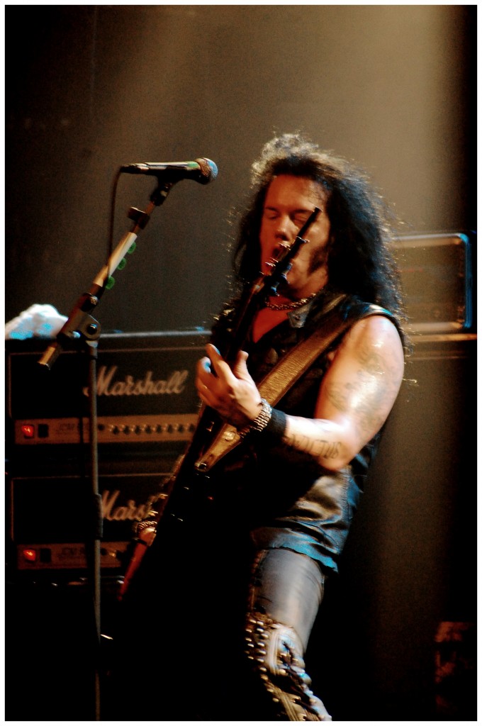 Tras algunos minutos, al escuchar «The Patriarch» ya todos enloquecíamos al saber lo que ahora nos esperaba (y lo cierto es que, de aquí al final, fue el verdadero nirvana para los amantes de KREATOR, una ristra de temas que son el auténtico clímax, la locura máxima), uno de sus himnos por excelencia, «Violent Revolution». Después llegó «United in Hate» y tras el, un tema dedicado a todos los «rip off» de la escena y de la música en general, «Betrayer». Tal fue la locura que era prácticamente imposible escuchar a Ville en el estribillo. Y también sabíamos lo que nos esperaba cuando Petrozza sacó al escenario (con una decoración excelente) una gran bandera de la banda: «It’s time to raise the flag of hate». Y empezó a sonar «Flag of Hate» tras Petrozza hacer que el público gritara el título del corte y comprobar qué tal nuestras cuerdas vocales. Gran canción de su debut, la cual se unió con el otro único corte que faltaba por escuchar aquella noche, el implacable «Tormentor», donde el publicó se desgañitó por completo. Final apoteósico a una actuación prácticamente perfecta. Inyección de adrenalina en vena, de esas que te dejan con ganas de más. Chapeau por KREATOR, por su esencia, magnetismo y carisma (porque su buen hacer a estas alturas es algo más que indudable). Chapeau también por su facilidad para cambiar por completo el ambiente de la sala y convertirlo todo en diversión y ganas. Lo cierto es que consiguen algo que va mucho más allá de un buen concierto, y solo se puede vivir viéndolos en directo (así que si tenéis la oportunidad, no lo penséis dos veces).