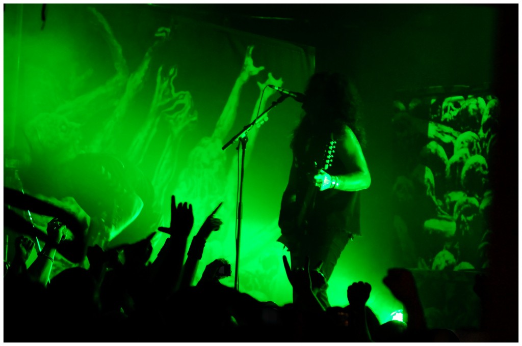 Tras una larga pausa de cerca de media hora, llegaba otro de los platos fuertes de la noche y la banda cabeza de cartel. Si en la sala con MORBID ANGEL no cabía ni un alfiler, hacia el final del concierto la gente se agolpaba incluso en las escaleras. Con un telón blanco, aparecían diversas proyecciones mientras sonaba la versión de Johnny Cash de «Personal Jesus» a modo de intro. Y finalmente, ahí estaban KREATOR, descargando toda su furia en forma de Thrash Metal con la canción que da nombre a su último disco, demostrando la potencia y agresividad que tienen temas de su último «Phantom Antichrist», como lo reafirmaron también con una de las más bestiales de esta última obra, «From Flood into Fire». El público comenzó a mover la cabeza y a hacer mosh sin parar desde que sonaron los primeros riffs de la banda, pero KREATOR es una formación que no deja de maquinar clásicos, de crear himnos atemporales sin importar la época en la que se hagan. Un ejemplo de ello es «Enemy of God», que hizo que el suelo de Salamandra temblara. Tras el, otro clásico de la misma talla, «Phobia». Sonido excelente, precisión y tablas, sin duda, y entrega igual de excelente, con la banda sin dejar de moverse por el escenario, además de un Mille que no dejó de derrochar palabras de agradecimiento a todo el público allí congregado, logrando caldear todavía más el ambiente y que toda Salamandra se convirtiera en una enorme fiesta thrasher.