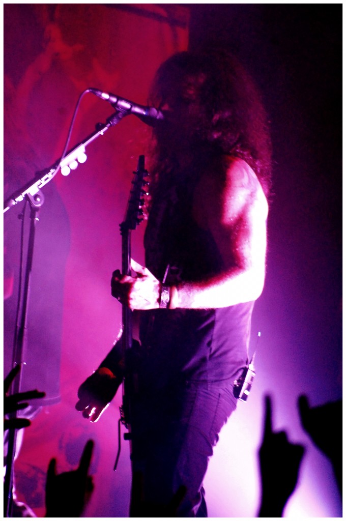 Si ya con FUELED BY FIRE nos resultó tarea imposible acercarnos al foso a hacer buenas fotos, no hablemos de cómo se encontraba la sala en el momento de la actuación de NILE, que venían a presentarnos su último «At the Gate of Sethu». Sin duda, teniendo en cuenta el enfoque más directo y brutal de esta última obra, muchas de sus canciones podrían funcionar muy bien en directo. Y así lo dejaron claro con «Supreme Humanism of Megalomania» hacia el final del repertorio porque, sorprendentemente, ese fue el único tema que NILE tocaron de su más reciente disco. Parece que querían satisfacer a sus seguidores, y desde un inicio con la brutal «Sacrifice unto Sebek» lo lograron, metiéndoselo en el bolsillo desde el primer instante, animando al público con tan solo un tema como no lo habían conseguido los californianos en todo su concierto (corto, eso sí). Con dos grupos todavía por tocar, los de Karl Sanders tenían poco tiempo, así que quisieron aprovecharlo al máximo y dar lo mejor de sí, tanto en técnica, brutalidad y profesionalidad como en selección de cortes, y no dudéis que lo hicieron. En los (aproximadamente) 45 minutos de su actuación no dieron tregua y repasaron toda su trayectoria descargando sin piedad títulos como «Kafir!», la densa y añeja «Sacorphagus» o «Ithypallic», para después despedirse de su público con la arrolladora «Black Seeds of Vengeance». Una forma de cerrar su impecable concierto por todo lo alto, posiblemente con su mejor exhibición de brutalidad y técnica. La precisión instrumental por parte de absolutamente todos los miembros del combo fue excelente. Un concierto en el que no les hizo falta interactuar demasiado con el público porque el público se entregó a ellos y a su calidad desde el momento en que pisaron el escenario. Teniendo poco tiempo por delante, se centraron en su música y en dejar el mejor concierto posible, y así lo hicieron. Lo cierto es que NILE nunca han sido santo de mi devoción, pero parece estar comprobado que es imposible que defrauden en directo.