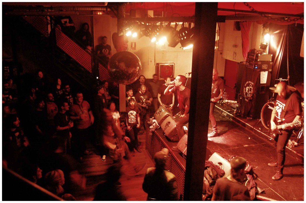Uno de los nombres más legendarios e inmortales de Crust anunciaba fechas españolas. No hablo de otros que de los ingleses DOOM, que llevan repartiendo cera sin tregua desde hace ya la la friolera de 30 años. 30 años siéndoles fieles a s Crust anárquico y bestial. Nosotros no quisimos perdernos su ración de ruido en Badalona, en la sala Estraperlo, donde estarían acompañados por dos bandas locales: los jóvenes BACTERIA FORTE y los ya más veteranos TOTÄLICKERS. Ni el fútbol pudo empañar una buena cita con los sonidos más furiosos e irreverentes.