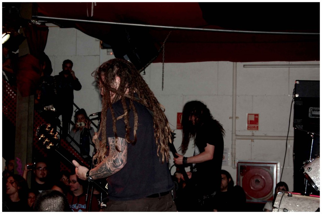 Cuando empieza a sonar la intro de «Reality Asylum», de CRASS, sabes que DOOM están a punto de comenzar. Y así fue. Llegaba el momento más esperado, el del plato fuerte. La sala ya era un hervidero antes de que los de Birmingham se subieran al escenario. Mientras sonaba la intro la banda se encontraba ya sobre el escenario, a excepción de Denis, que se subió a las tablas cuando empezaban a sonar las primeras notas de «Thanatophobia». Descarga de adrenalina y energía bestial, desde el mismísimo comienzo. Nos esperaba la verdadera destrucción. Destrucción sónica y de nuestras cervicales, ya que el mosh fue prácticamente constante a lo largo de todo el concierto de los ingleses. Así mostraron estar en plena forma, con alrededor de una hora de rabia hecha ruido. Conciertazo en el que no faltaron temas como «Fear of the Future», «Claustrophobia» o «Antisocial». Retahíla de cortes que fueron cayendo uno tras otro sin pausa. Furia sin concesiones ni miramientos, sin darnos ni darse un solo respiro. También nos regalaron pistas como «Trash Beeds Trash», «War Crimes», por lo que el repertorio fue también excelente, tocando canciones de todas sus épocas. Por otro lado, el sonido fue aplastante, la actuación del grupo dinámica y su ejecución impecable. La voz de Denis es terriblemente profunda y densa, con unas grandes guturales, mientras que el asfixiante bajo de Scoot no deja de resonar, acompañando al característico tono de guitarra de Bri Doom, ya marca de la casa. Unos maestros en lo suyo. Cuando uno ve a una formación como esta, se da cuenta de por qué se han ganado el título de «leyendas» dentro del género.