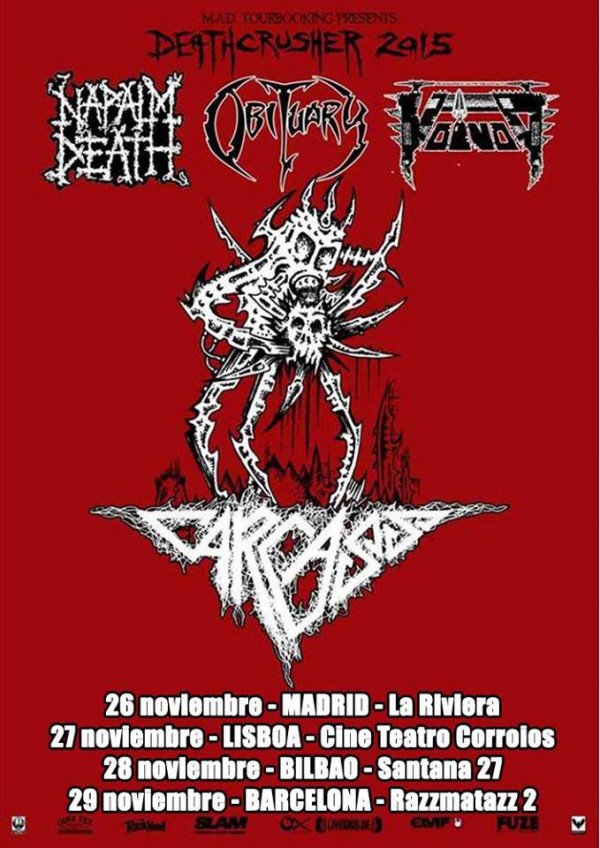 Carcass encabezarán el Deathcrusher Tour, una banda británica de metal extremo procedente de Liverpool. Carcass surge como una banda brutal llena de energía, con líricas sobre enfermedades humanas, con una atmósfera carnicera y llena de un sonido crudo e intenso. Fueron innovadores, formando parte de la oleada de bandas de agresividad como Napalm Death y Pungent Stench. También acabarían convirtiéndose en una de las bandas pioneras del death metal melódico con el álbum Heartwork.