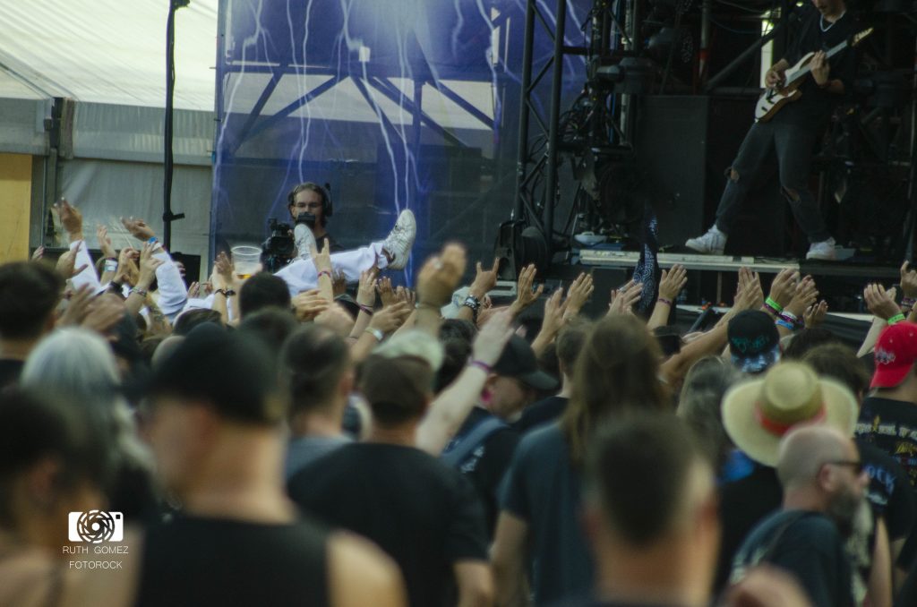El público ya no puede parar quieto, se forman pogos, circles pitts, y porque no decir, que la compañera de otro medio, Lucia y yo, que andamos buscando que se genere movimiento y se cree el centro de la tormenta, somos las primeras en abrir la veda del crowd surfing, aunque el público aún esta un poco verde y en el primer intento no consigo llegar hasta el foso, y los chicos se dedican a acompañarte desde el principio en lugar de dejarte ir, porque además hay muchos claros y el tortazo hacia el suelo está predestinado. ( por suerte todo fue bien, y a la segunda conseguí llegar jaja)